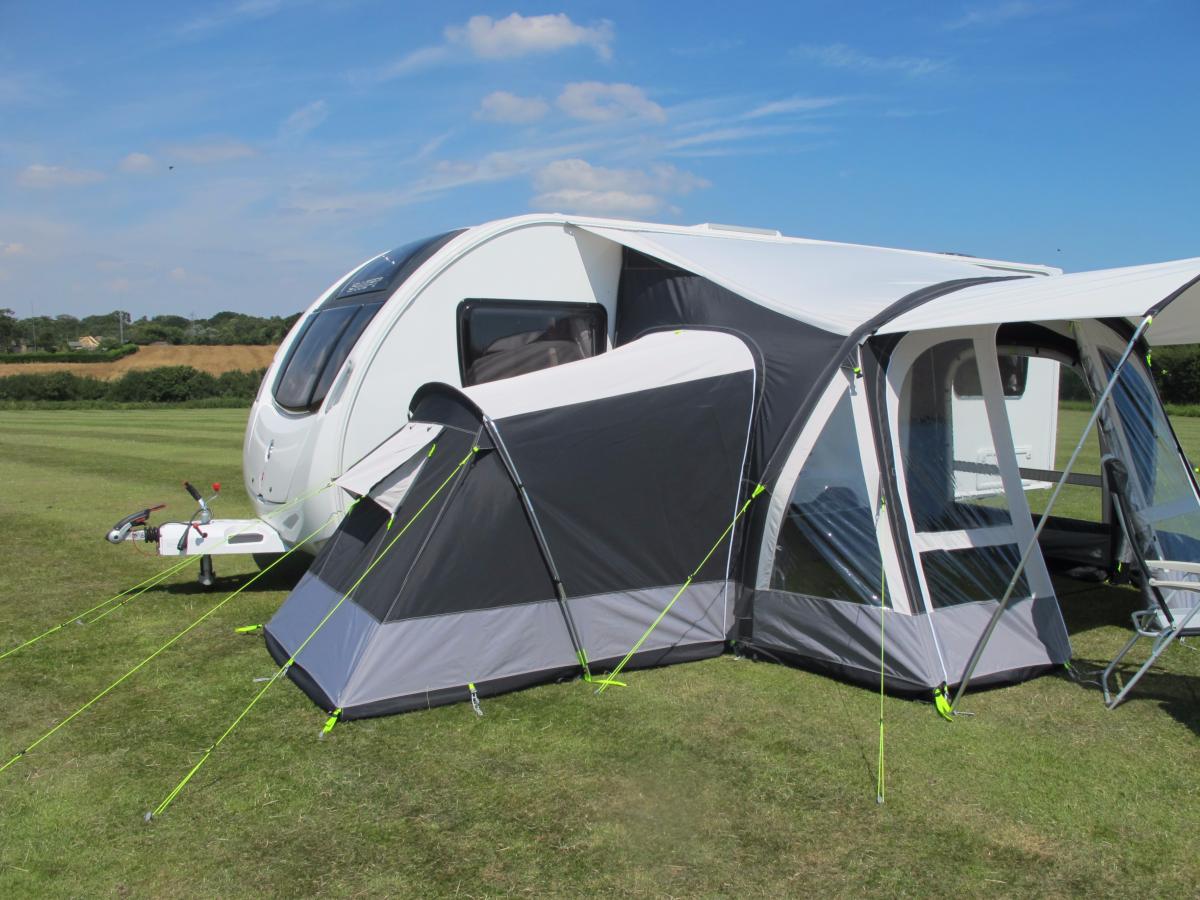 The all new Kampa Fiesta 350 Pro Air inflatable caravan awning with otional bedroom annexe and sun canopy
