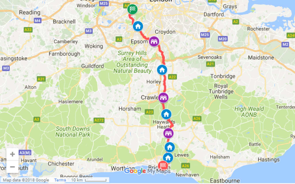 BHF London to Brighton Off Road Cycling Route. Save Share. Embed Copy URL. Export TCX Export GPX Print. Details. 120.63 km. 1,245 m. Taken from the 2016 PDF route map. Created By. Russ P.